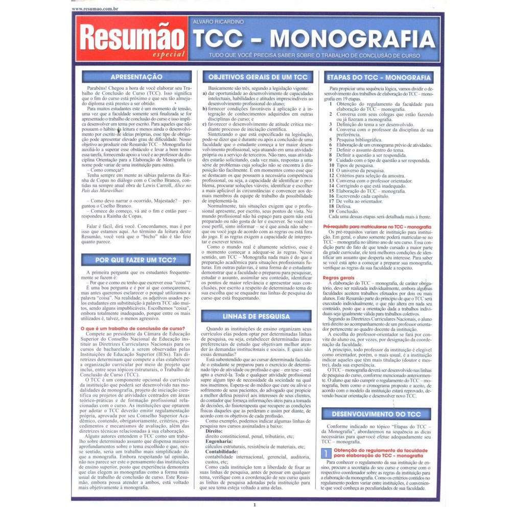 Um guia criado para ajudar o estudante universitário a fazer o trabalho de conclusão de curso. Escrito em linguagem bastante informal, traz um passo a passo detalhado de todas as etapas que o aluno deve cumprir para atingir o resultado esperado: por que fazer um trabalho de conclusão de curso, objetivos gerais do trabalho, as diversas linhas de pesquisa. O desenvolvimento do projeto e as etapas do trabalho. E ainda: quadro com um cronograma prévio de atividades.