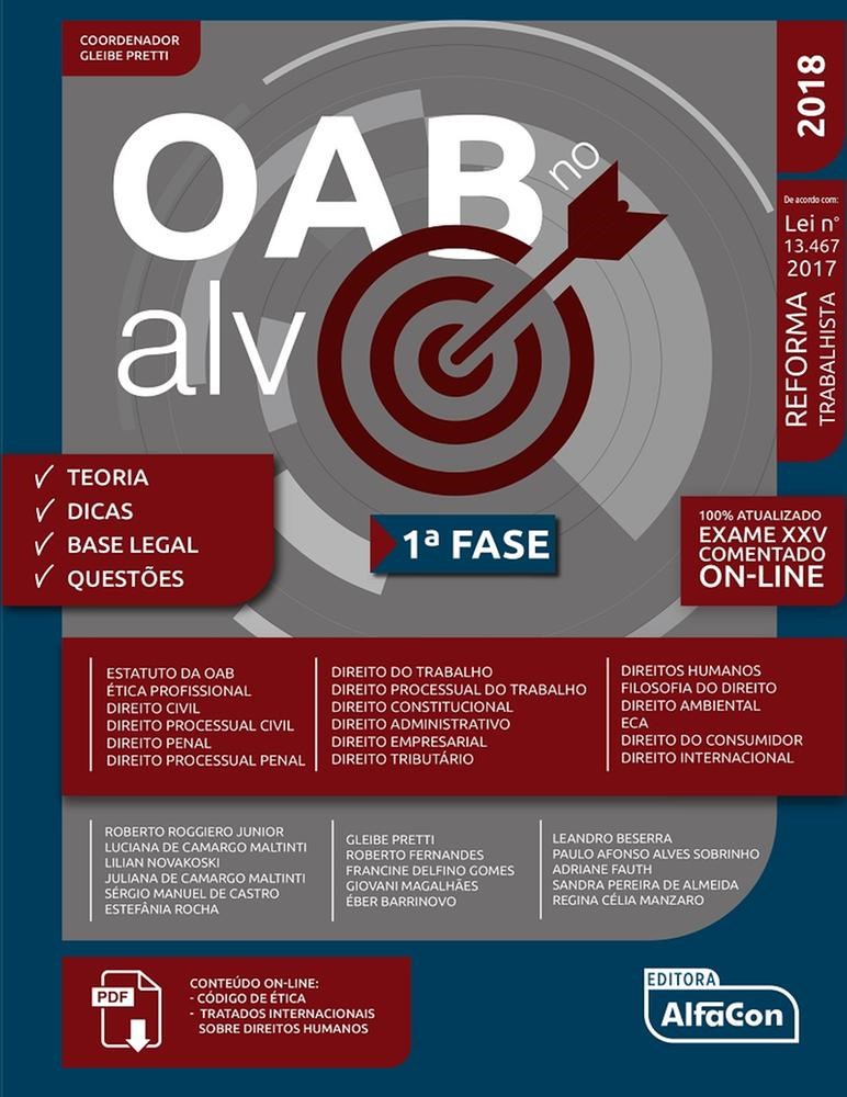 "O título desta obra, OAB no Alvo, não é meramente figurativo. Isso porque o que está na mira é justamente a SUA APROVAÇÃO no Exame de Ordem. Em um único livro, você encontrará todo o respaldo necessário à sua preparação para a 1ª fase do Exame, tanto no que tange ao REFERENCIAL TEÓRICO como à RESOLUÇÃO DE QUESTÕES. Este material foi elaborado por EXPERIENTES PROFESSORES e, cada um deles, com sua expertise e didática, contribuiu para o aprendizado e para a fixação dos conteúdos. A teoria elaborada pelos autores é articulada por meio de uma linguagem didática e objetiva e versa sobre os conteúdos mais abordados nos Exames de Ordem. No formato online, constam as questões comentadas do Exame XXV. Além disso, a obra se destaca por agregar ao seu estudo a tecnologia educacional AlfaCon Notes, ferramenta cuja funcionalidade consiste em registrar suas anotações por meio do QR Code. O objetivo é justamente o de deixar tudo organizado e acessível em sua área do aluno AlfaCon e em seu smartphone. CONTEÚDOS CONTEMPLADOS: ESTATUTO DA OAB ÉTICA PROFISSIONAL DIREITO CIVIL DIREITO PROCESSUAL CIVIL DIREITO PENAL DIREITO PROCESSUAL PENAL DIREITO DO TRABALHO DIREITO PROCESSUAL DO TRABALHO DIREITO CONSTITUCIONAL DIREITO ADMINISTRATIVO DIREITO EMPRESARIAL DIREITO TRIBUTÁRIO DIREITOS HUMANOS DIREITOS HUMANOS FILOSOFIA DO DIREITO DIREITO AMBIENTAL ECA DIREITO DO CONSUMIDOR DIREITO INTERNACIONAL"